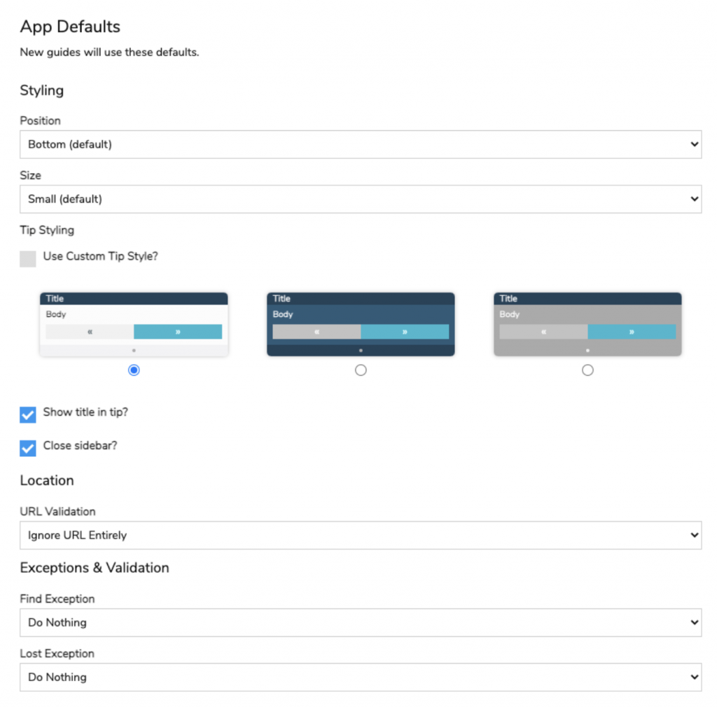 App Defaults allow you to customize the default settings for your JumpSeat content. Specifically, you can set Styling, URL Validation, and Exception defaults. These default settings will apply to all new JumpSeat content. Note that these are just default settings- each individual tooltip will still be editable when authoring.