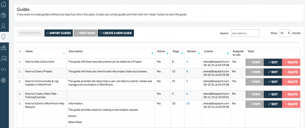 JumpSeat tracks changes and updates made to guides through Guide Versioning. Each time a guide is changed in any capacity (name change, tooltip change, copy change, etc.)
