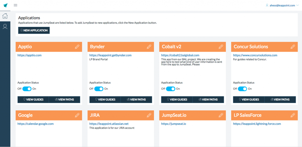 JumpSeat (yourjumpseat.jumpseat.io) hosts your organization’s SaaS applications for which you want to provide learning content and application based notifications. Within JumpSeat, each hosted application has dedicated administrative areas to further manage users, guides and insights for the application.